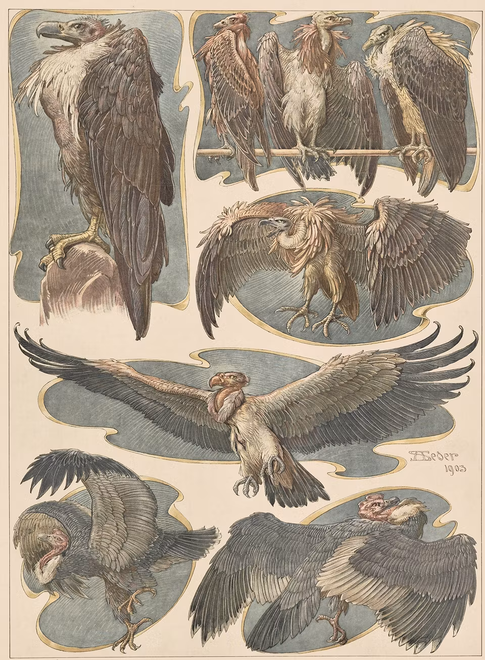 Nytryckt reproduktion från det ikoniska och unika Jugend ornament planschverket DAS THIER IN DECORATIVEN KUNST, av den tyske konstnären och professorn ANTON SEDER (1850-1916), publicerat 1896 av Gerlach & Schenk, Wien, Österrike.