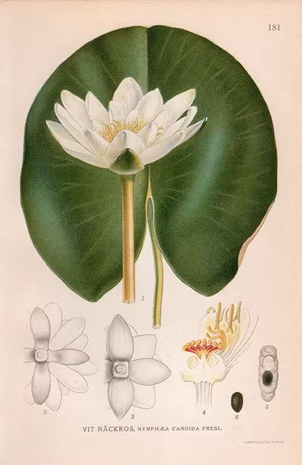 VIT NÄCKROS (Vattenlilja) från botanikern och konstnären Carl Axel Magnus Lindmans (1856-1928) illustration till "Bilder ur Nordens Flora" (1922).
