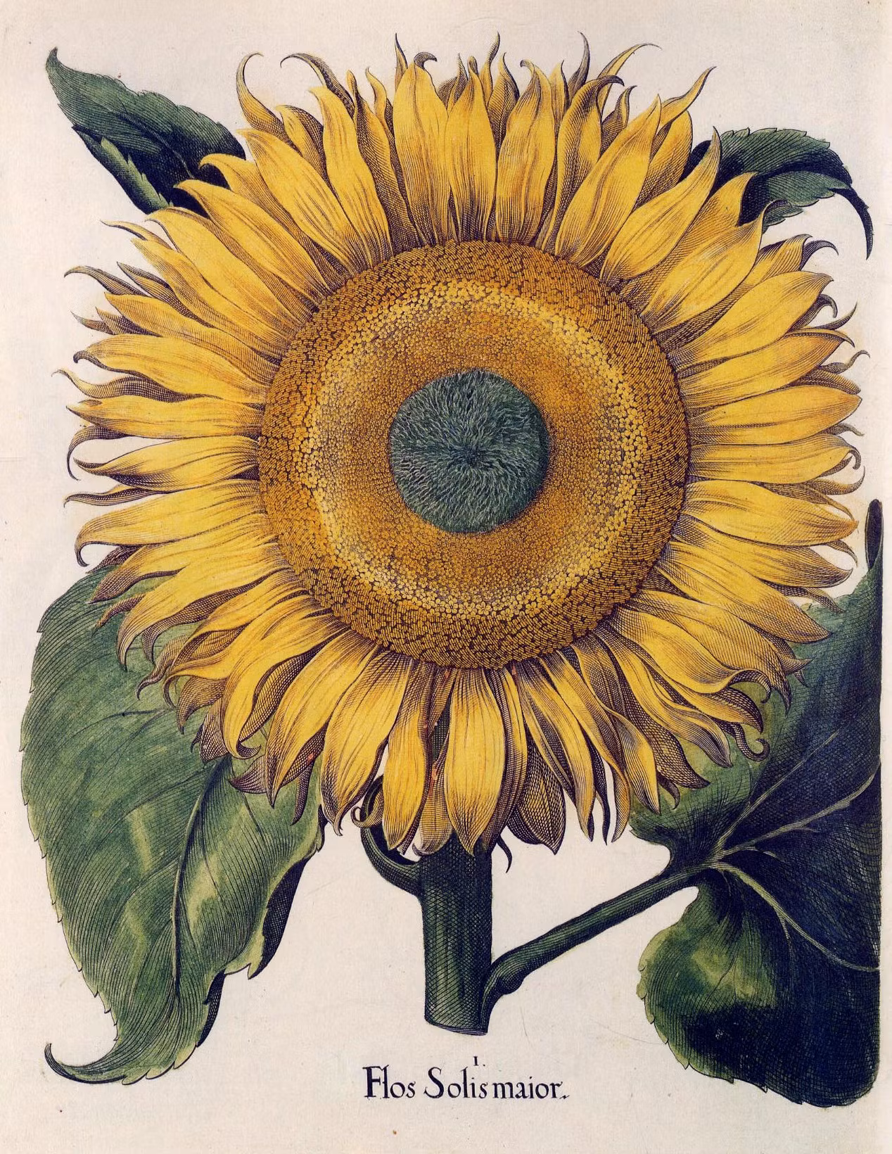 SOLROSOR (60 x 46 cm) från Basilius Beslers (1561-1629) otroliga och magnifika dokumentation av den legendariska blomsterhagen i Eichstätt, Bayern på uppdrag av biskop Johann Konrad von Gemmingen (1561-1612).