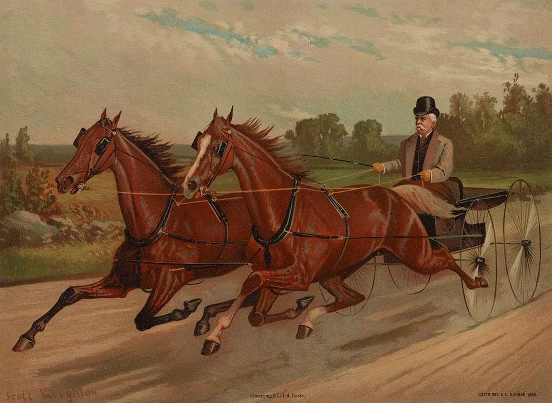 ”HORSES AND BUGGY”, skapad av konstnären Scott Leighton, och publicerad av Armstrong & Co Lith. Boston. (Copyright E.K. Dunbar 1888.)
