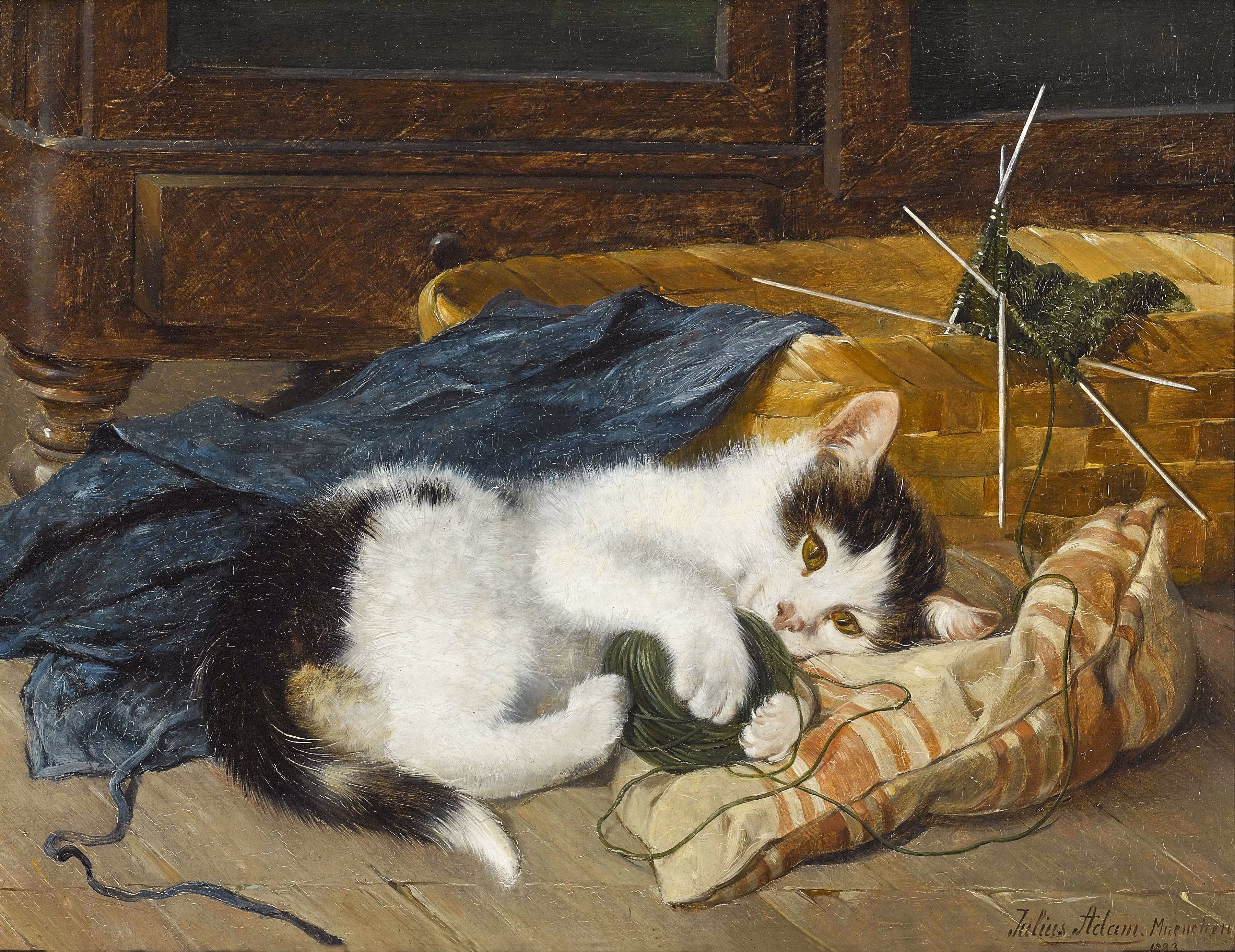 Gullig kattplansch av den tyske målaren och litografen JULIUS ANTON ADAM II (1852-1913) från München – också kallad Katzen-Adam. Som man kan förstå från Adams smeknamn, var han synnerligen populär som en mästarporträttör av katter ochräknas fortfarande bland de främsta inom denna konstart som fick bred spridning bland annat som lackerade litografier och oljetryck.