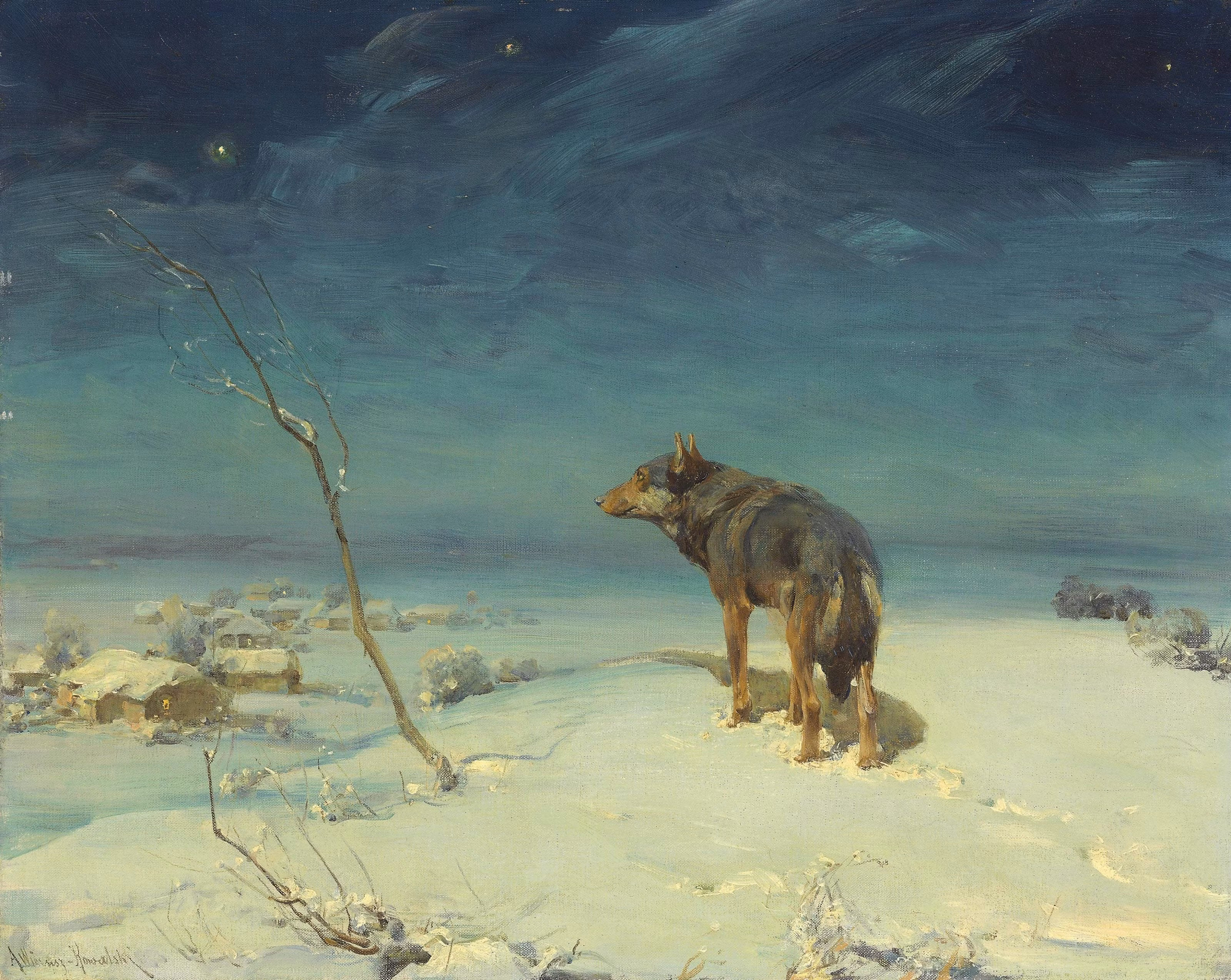Alfred von Wierusz-Kowalski (1849, Polen - 1915, Tyskland) var en polsk målare av "München skolan". Hanär för oss en doldis men i Tyskland och även USA var hans stämningsfulla, vackra och dramatiska målningar av mestadels hästar, vargar och jaktscener omåttligt populära. Hans bild "Ensam Varg" var en av 20:e århundradets mest reproducerade målningar.